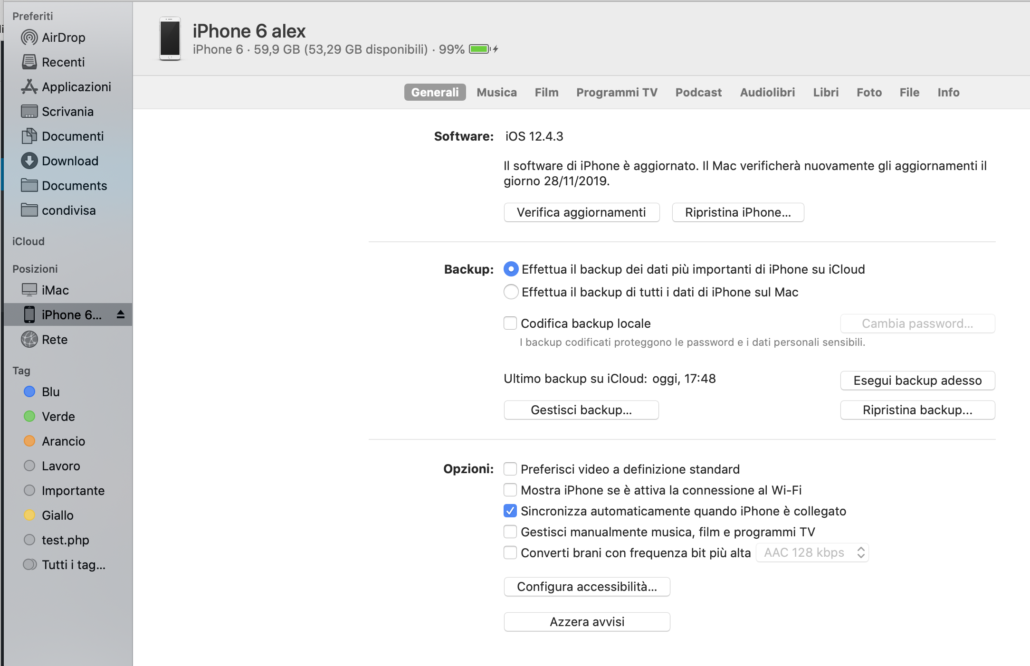 Toccando il nome del nostro iPhone, visualizzeremo una schermata che ci è molto familiare perchè sarà uguale a quella presente in iTunes. Attraverso questa pagina potremo aggiornare il dispositivo, ripristinarlo, effettuare i backup, la sincronizzazione e tanto altro ancora.